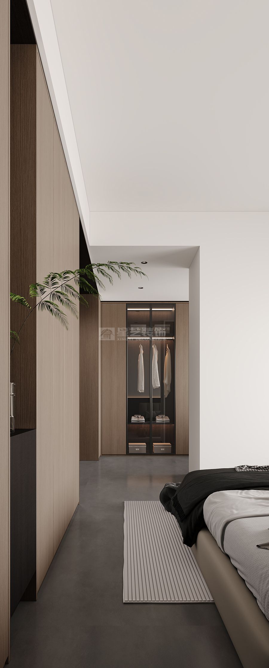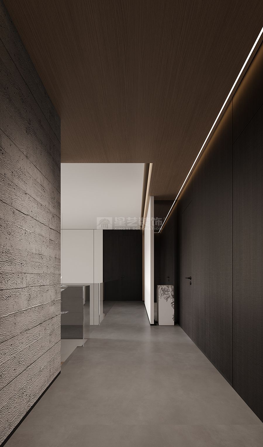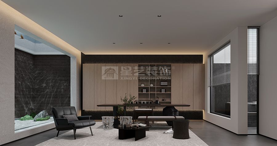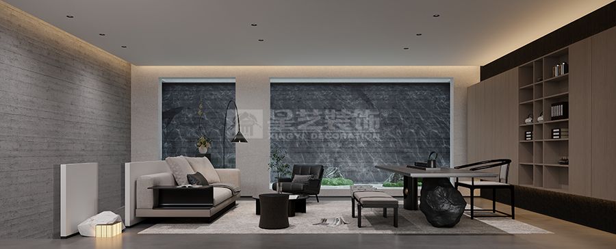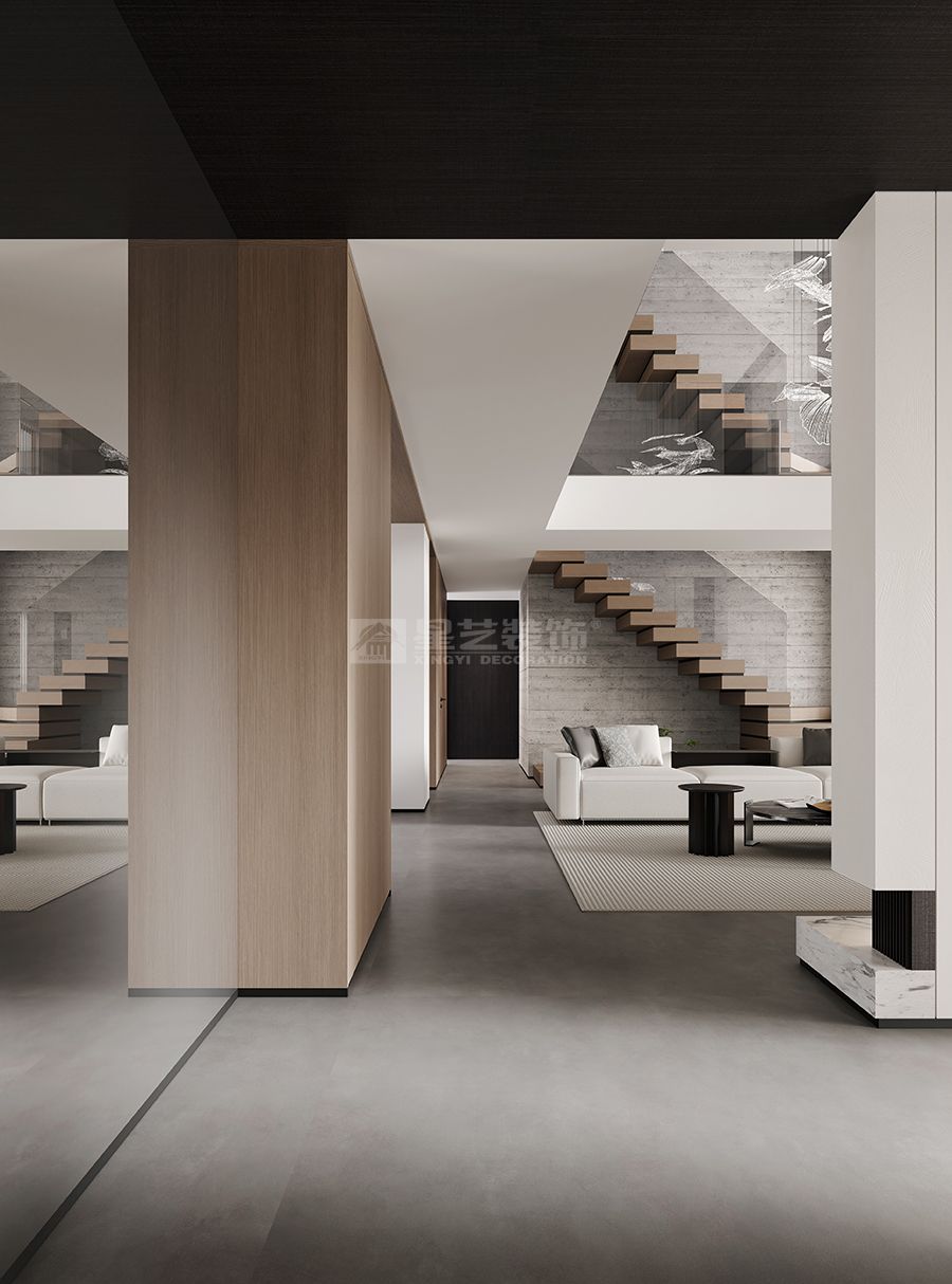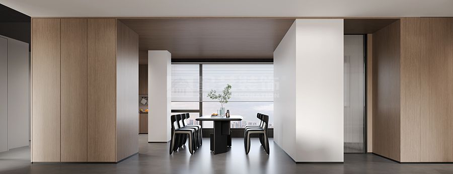 "鑿戶牗以為室,當(dāng)其無(wú),有室之用"的東方智慧,在本案中化作當(dāng)代空間語(yǔ)言。我們以物質(zhì)構(gòu)筑為筆觸,在虛實(shí)相生中書(shū)寫(xiě)空間詩(shī)學(xué)——混凝土的堅(jiān)實(shí)肌理與木質(zhì)的溫潤(rùn)觸感相互制衡,黑色木飾面的冷峻與留白墻體的純凈形成對(duì)話,在材料對(duì)位中演繹"有之以為利,無(wú)之以為用"的永恒命題。