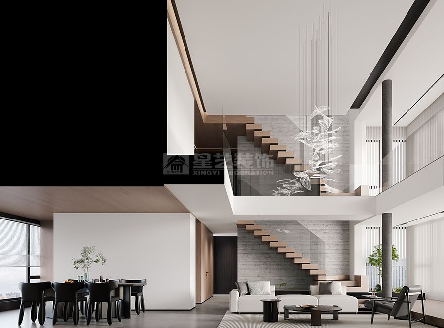 追溯童年河岸的構(gòu)筑記憶,將不同材質(zhì)的體塊轉(zhuǎn)化為空間標(biāo)點(diǎn):入戶處的深色體量如重音符號(hào)懸垂,餐廳木質(zhì)構(gòu)造似展開(kāi)的書(shū)頁(yè),混凝土盒體在梯間若隱若現(xiàn)。這些物質(zhì)標(biāo)點(diǎn)通過(guò)拓?fù)渲亟M,編織出富有節(jié)奏的虛空網(wǎng)絡(luò),當(dāng)穿行其間,恍若重拾以卵石界定溪流的童稚智慧,體驗(yàn)被物質(zhì)引導(dǎo)的空間敘事。